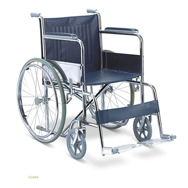 The Standard Wheelchair is a practical and durable mobility solution designed for daily use. With its 18" wide seat, chromium-finish frame, and manual propulsion system, it provides essential support for those with mobility limitations.